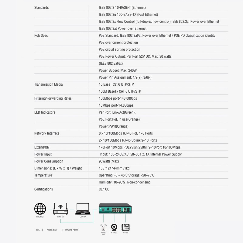 8 Fast Ethernet Ports: Equipped with 8 Fast Ethernet ports, this switch offers high-speed data transfer with 10/100/1000 Mbps, ensuring smooth and efficient network performance.
